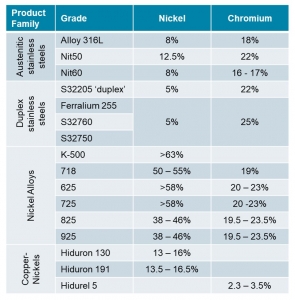 It should be noted that the impact of nickel price volatility on duplex and super duplex stainless steels is far less than most other alloys. They contain just 5% nickel, compared with 8% for Alloy 316L, >12% for Nit50, and 45-65% for nickel-based alloys such as Alloy 625, 718, 725, 825, 925 or K-500.