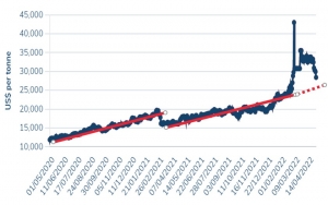 In early March, the London Metal Exchange (LME) index had been increasing steadily towards $25,000/T. It had generally been rising for more than 2 years, but the rate of change was increasing, perhaps as the world emerged from the effects of Covid and the supply-demand balance shifted. However, the price spiked to $44,000/T and then $101,000/T in the space of a day before trading was suspended. This was associated with the action of various traders, rather than the underlying demand for this important metal. However, it took more than three weeks for ‘orderly trading’ to be restored, and for steel mills to feel sufficiently confident to re-issue price lists – albeit with nickel now trading at >$33,000/T.