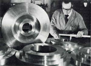 These FERRALIUM 255 alloy forgings, seen being tolerance checked between machining operations at Langley, are 24” in diameter with sections of up to 5 ½ “, weigh approximately 400 lb each, and after fine balancing, will operate at 15,00rpm. They will be used in compressors handling hot gases containing hydrogen disulphide and sulphur dioxide in an overseas Petro-chemical complex. Because of FERRALIUM 255 (UNS S32550, Alloy 255, DIN 1.4507, ASTM F61) particularly high resistance to stress corrosion cracking it was chosen to replace failed sets of forgings made in ordinary ferritic stainless steel.