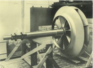 This fan impeller provides an example of its versatility. The boss is cast, and the blades are rolled and shaped from the plate then welded to the blade roots cast in the boss. The side plates are also of the plate, the conic-shaped segments being welded together then the boss and blades. The whole thing is 71” in diameter and weighs, as shown, nearly 1 ½ ton.