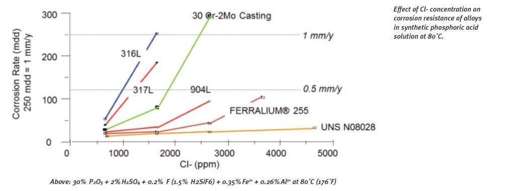 Ferralium has a superior corrosion resistance to many other metals in chloride-containing media at most concentrations, including both Alloy 904L and 3xx series austenitic stainless steels It also has a lower threshold chloride content for the initiation of localised corrosion; consequently, it outperforms these alloys in the hemihydrate process where operating conditions are harsher due to the higher temperature and lesser rock quality requirement of this process.