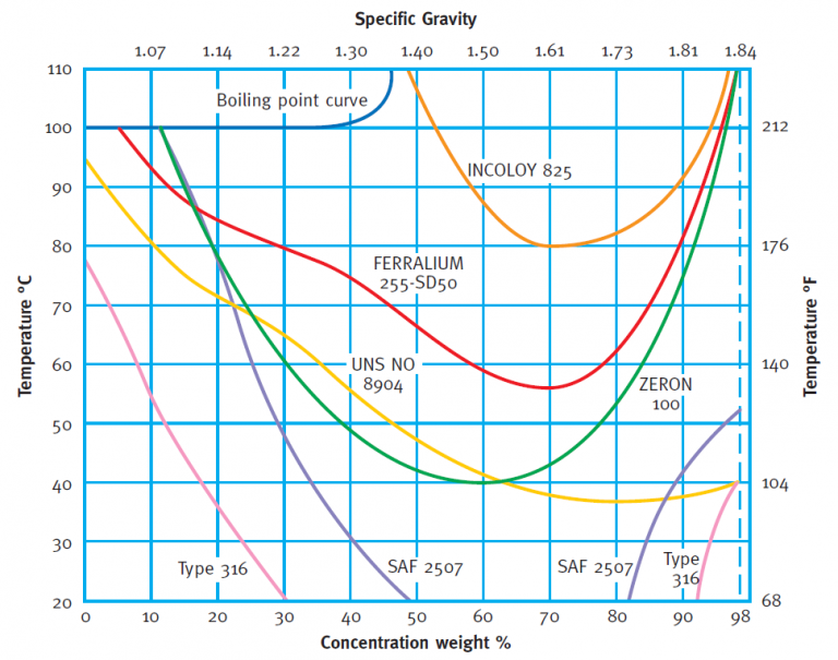 The iso-corrosion curve shown below highlights that Ferralium outperforms a large number of austenitic, duplex and super duplex stainless steels in sulphuric acid at all concentrations and temperatures.