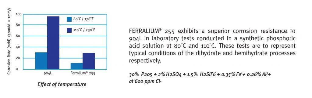 As demonstrated above, the use of Ferralium is well-established in this application, as its high copper content compared with other duplex and super duplex grades improves corrosion resistance in sulphuric acid. It has been shown to outperform 904L (UNS N80904) in most areas of the phosphoric manufacturing process and as it is of a much lower nickel content it offers a very cost effective solution.