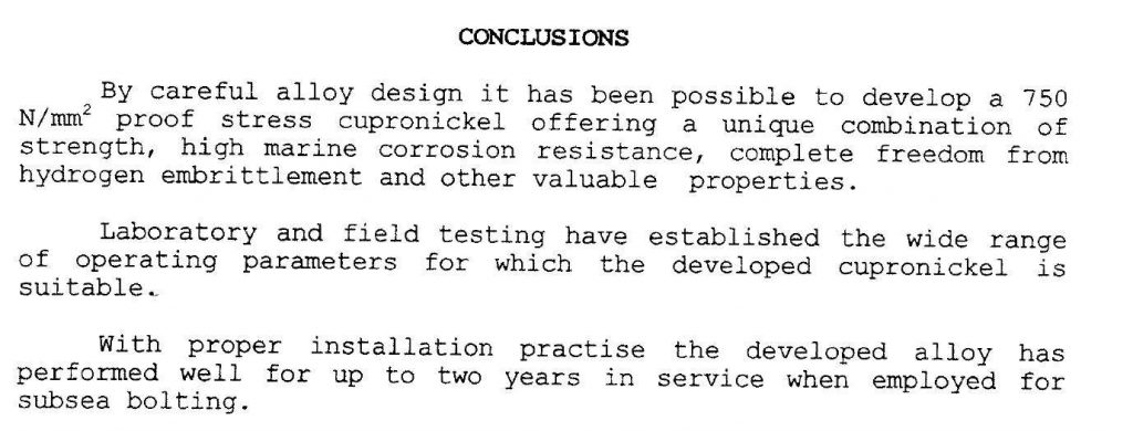 This paper provides an excellent summary of the development process, performance and use of the high-strength cupronickel Hiduron 220.